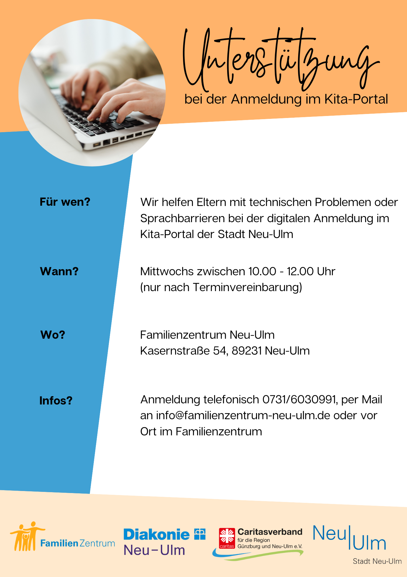 Ab 15.01.2026 erfolgt die Vergabe von Kita-Plätzen in Neu-Ulm zentral über das Kita-Portal der Stadt Neu-Ulm. In Kooperation mit der Stadt unterstützt das Familienzentrum Eltern, die bei der Online-Anmeldung Hilfe benötigen – zum Beispiel bei technischen Problemen oder Sprachbarrieren.