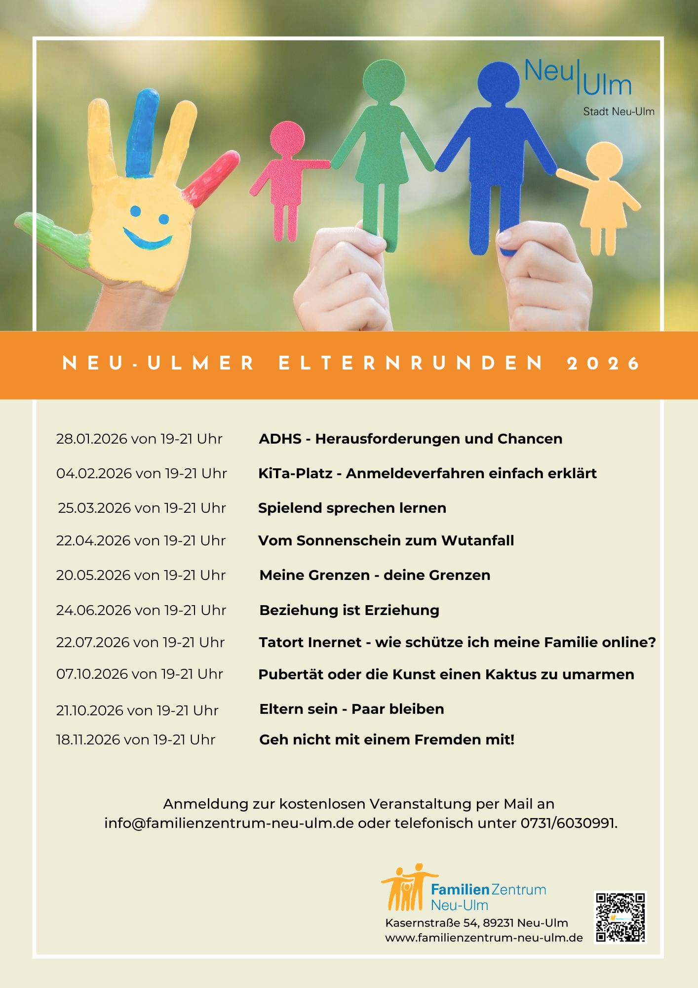 Die Neu-Ulmer Elternrunden bieten wieder ein abwechslungsreiches Jahresprogramm mit 10 Abenden, die über das Jahr verteilt stattfinden. Im Mittelpunkt stehen sowohl bewährte Erziehungsklassiker als auch aktuelle pädagogische Themen, die Familien heute bewegen. Die Abende bieten Raum für Austausch, Impulse und praxisnahe Anregungen für den Familienalltag.