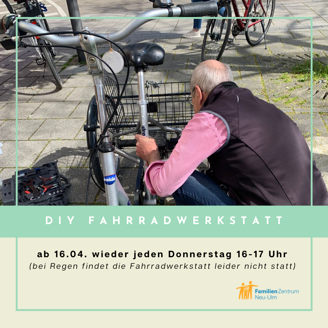 Ab dem 16.04.2026 nimmt die DIY-Fahrradwerkstatt des Familienzentrums wieder ihren Betrieb auf. Das offene Angebot findet künftig jeden Donnerstag von 16 bis 17 Uhr auf dem Platz vor dem Familienzentrum statt.